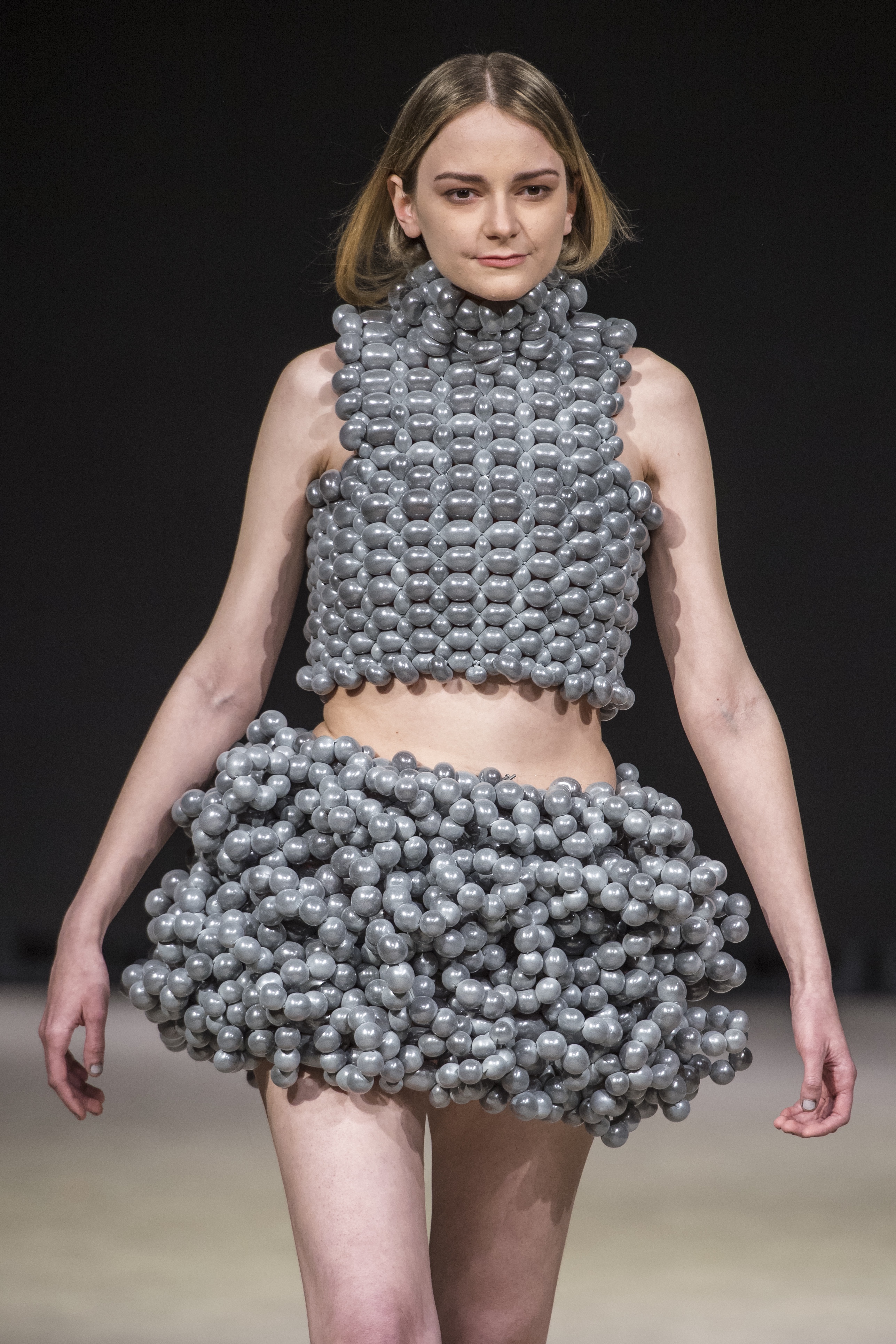 Japanese designer Emi Jingushowed off the endless artistic possibilities of balloons with her collection ‘Unlimited’. She captivated the audience with her innovative and sophisticated dresses each using the unique material of balloons. Jingu pushes artistic boundaries as she effortlessly coordinates a metallic palette of grey, bronze and gold tones while intricately layering balloons of different dimensions in such a way to create elegant couture silhouettes. Jingu’s dresses featured peplum-styles, slim bodices, and flared skirts, highlighting her extraordinary talents. The eccentric garments were complemented with sleek hairstyles, glossy makeup with ashy tones, and stilettos to encompass the chic futuristic style.