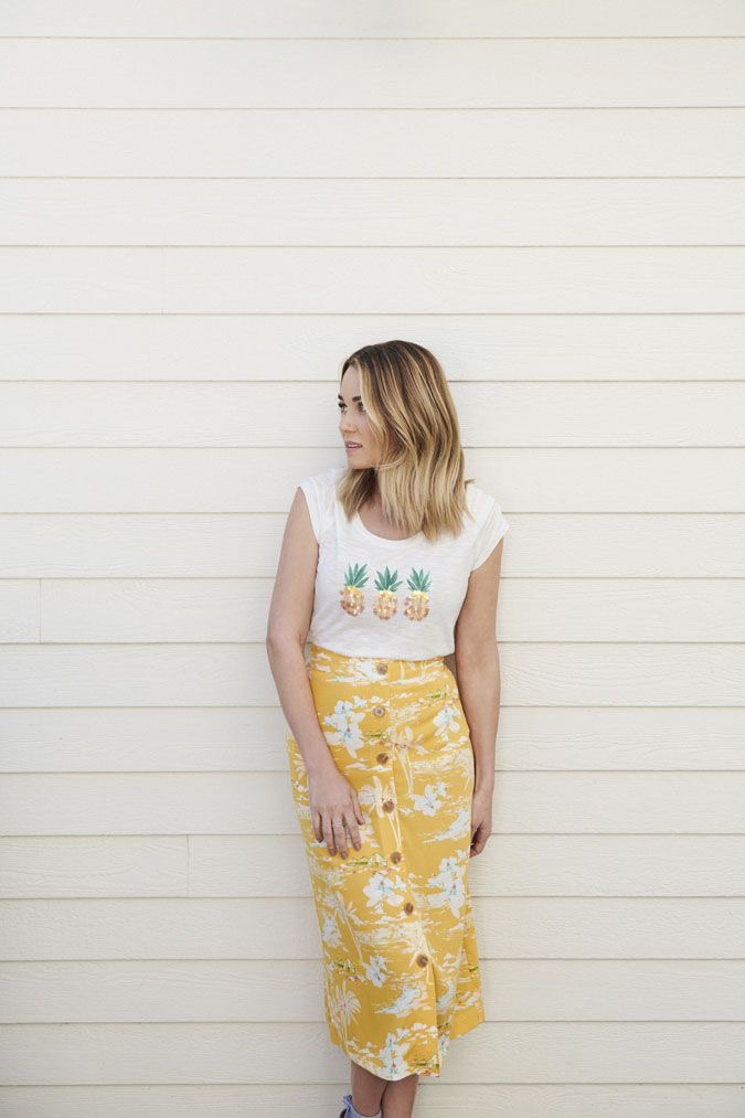 Lauren kicks LC Lauren Conrad June off with a graphic tee and button-down front midi skirt that’s screaming yellow all the way down to the ground, balanced out with the white graphic t-shirt splashing shiny art on the shirt, also save yourself for Lauren’s orange square neck jumpsuit with cat-eye sunglasses that give the usual square sunglasses a much needed break.