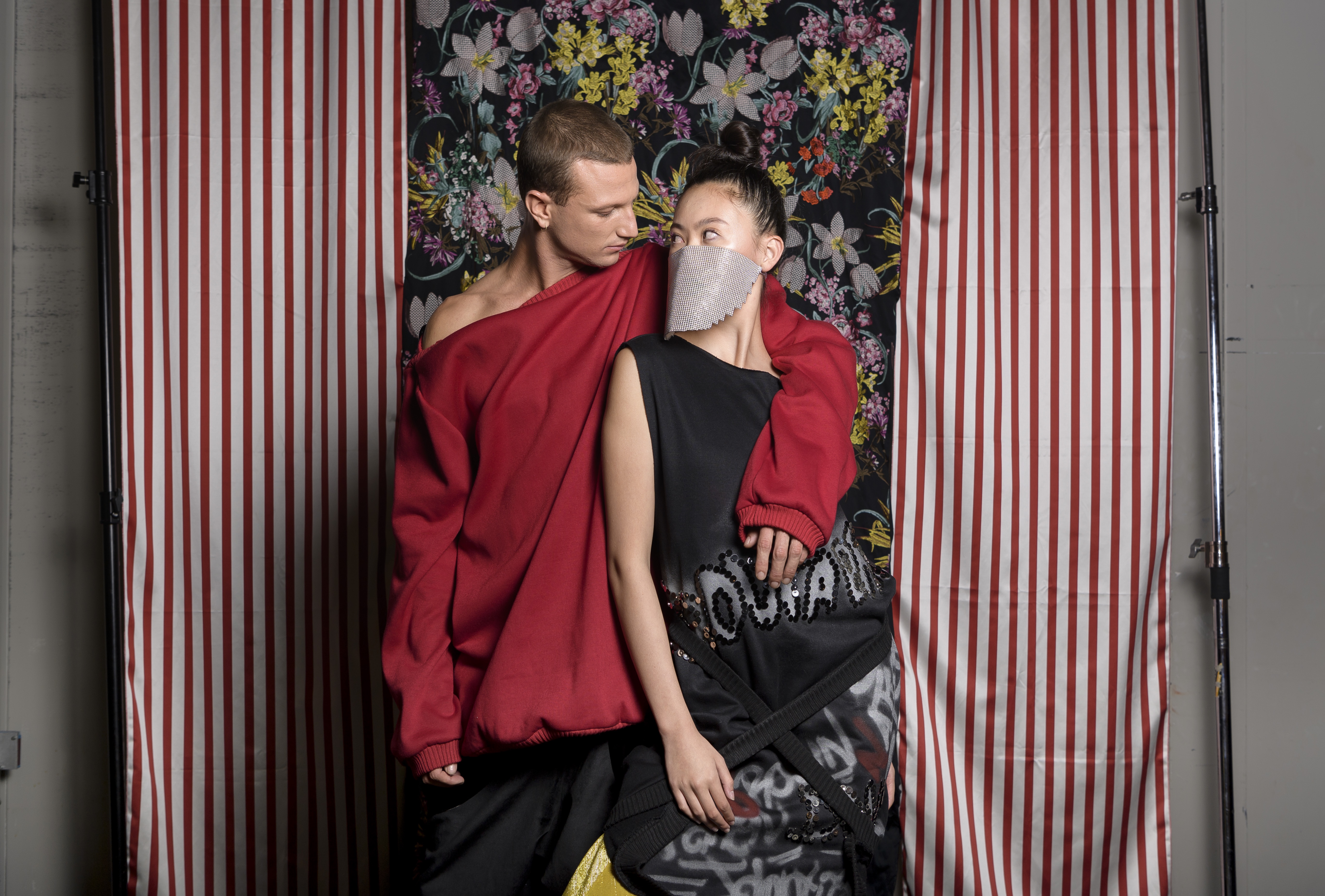 The colors are dark using red & black fabrics, the embellishments are inspired by the lights in the city of Hong Kong, and the designs are oversized. G says “people look at hoodies and think “street rat” but this represents far more than that, it is the need to be visible, to tell the story of the rat race yet still feel protected and safe.