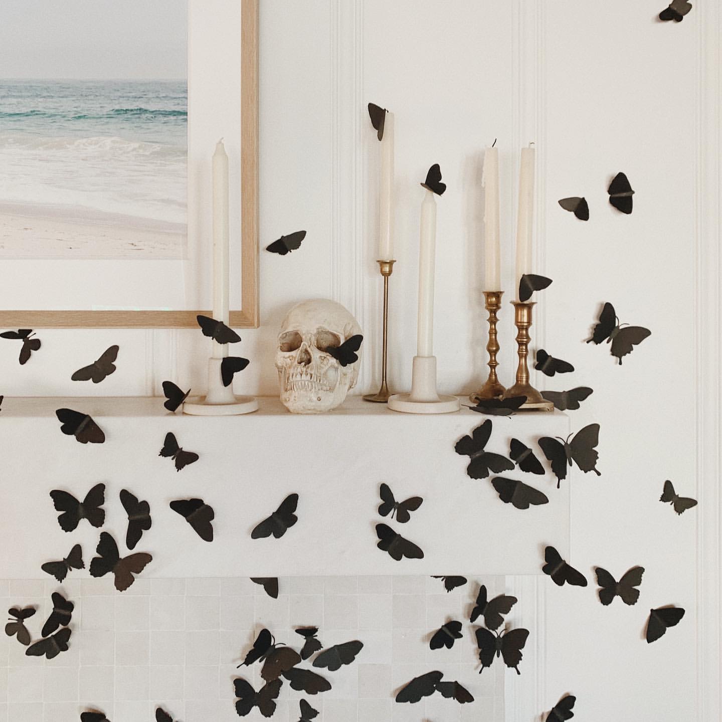 In all the hype and masquerading of Halloween every year, especially in New York, there’s always a little cuteness and whimsical moments found behind the scariness and sexiness, it’s found on Lauren’s fireplace mantel where it’s all decorated with delightful little and big black butterflies, where at first glance they look like bats, the only scariness added are the color black on the butterflies, adding the spookiest effect to what otherwise beautiful butterflies.