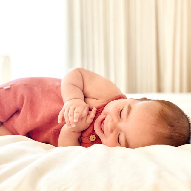 There Charlie is, laying so happily on his blanket, facing the camera in a dark mauve colored onesie, being the bundle of joy that of Lauren and family.