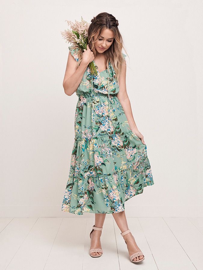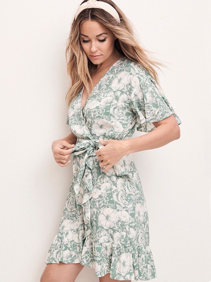 In proper order, Lauren kicks off her LC Lauren Conrad looks saluting spring, first with Floppy Hat with Heart Embellishment, Knotted-Strap Tank, Utility-Pocket Pants, and Candide Crossbody Bag, the next look celebrates the best of spring, green, and florals in one, it’s the ruffle wrap dress which signals a flower orchard, and the ever-growing trend of florals.