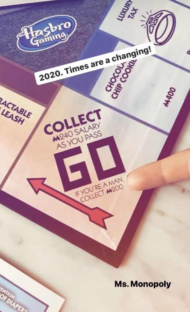 At the corner of the board, a woman collects $240, while a man only collects $200, Kristin and children playing are astonished about a woman getting more money than a man does, there’s another case when a woman gets a promotion, they get $150, while a man who does the same job only collects $100.