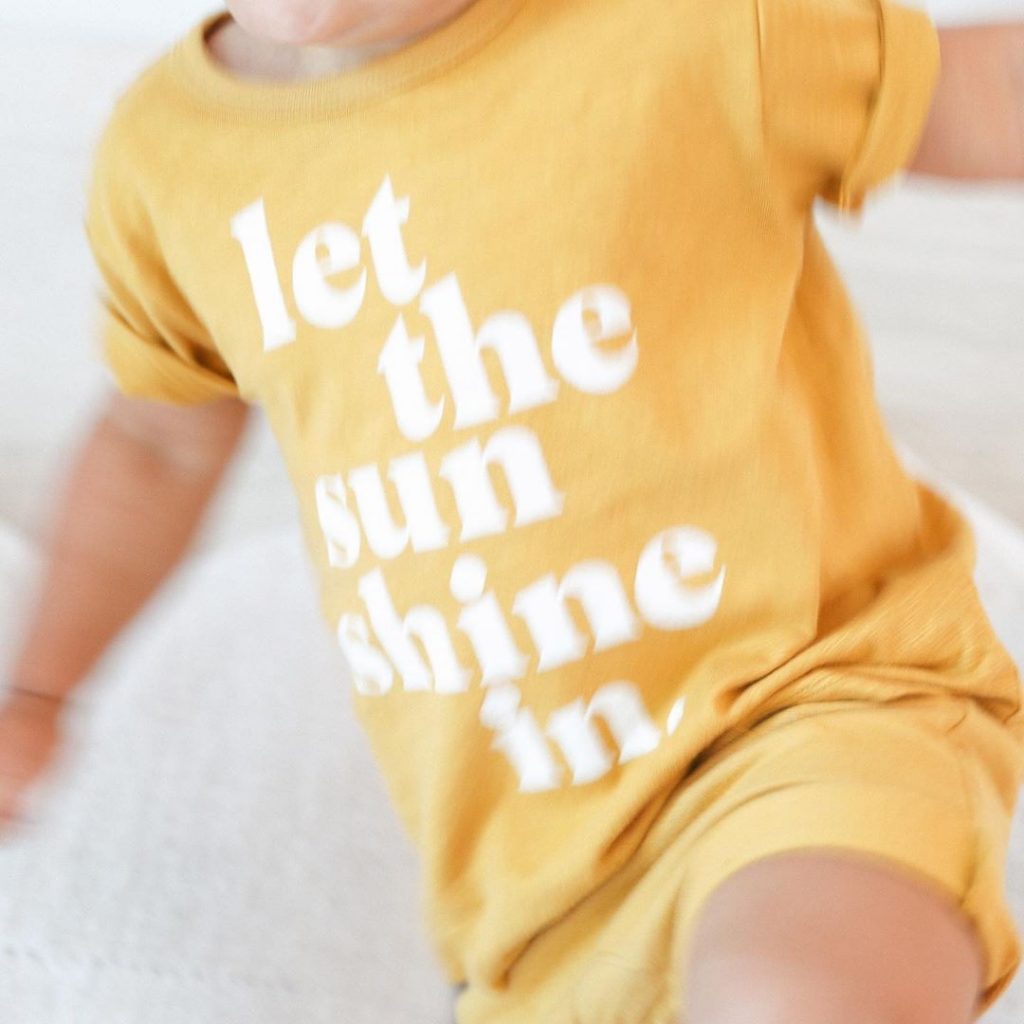 “Let The Sunshine In” with the Organic Graphic Tee Shirt in short sleeves, snap-button neckline, sewn-rolled hem, breathable fabric, soft hand feel, and slubbed construction, it’s 100 percent organic cotton slub Jersey, and global organic textile standard certified.