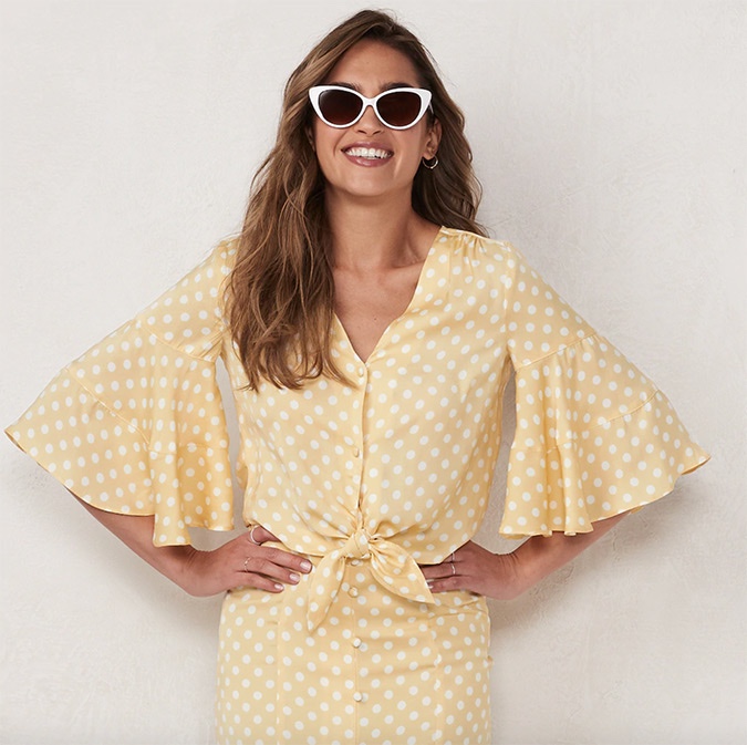 Lauren has the flare-sleeve bottom-down top colored in eddie dots that creates a fun, trendy, and eye-catching look with v-neck, flared sleeves, and button front.