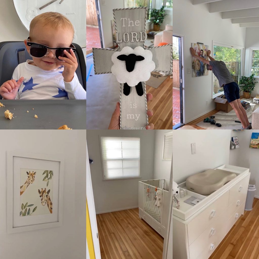 It was a day where one-year-old Elvis got to test drive his dad’s swagger with stars and sunglasses, hang up meaningful fixtures for Elvis’s nursery like a little lamb cross with The Lord Is My Shepherd, books and giraffe portraits, and Amanda’s brother-in-law hanging a portrait of the family that Nick blossomed.