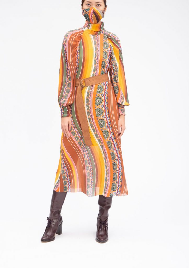 One piece from Vivienne Tam’s new collection is the Pink Large Ceiling Scarf paired with Mortage High Collar Dress, printed on stretch netting and made of 100 percent cotton.