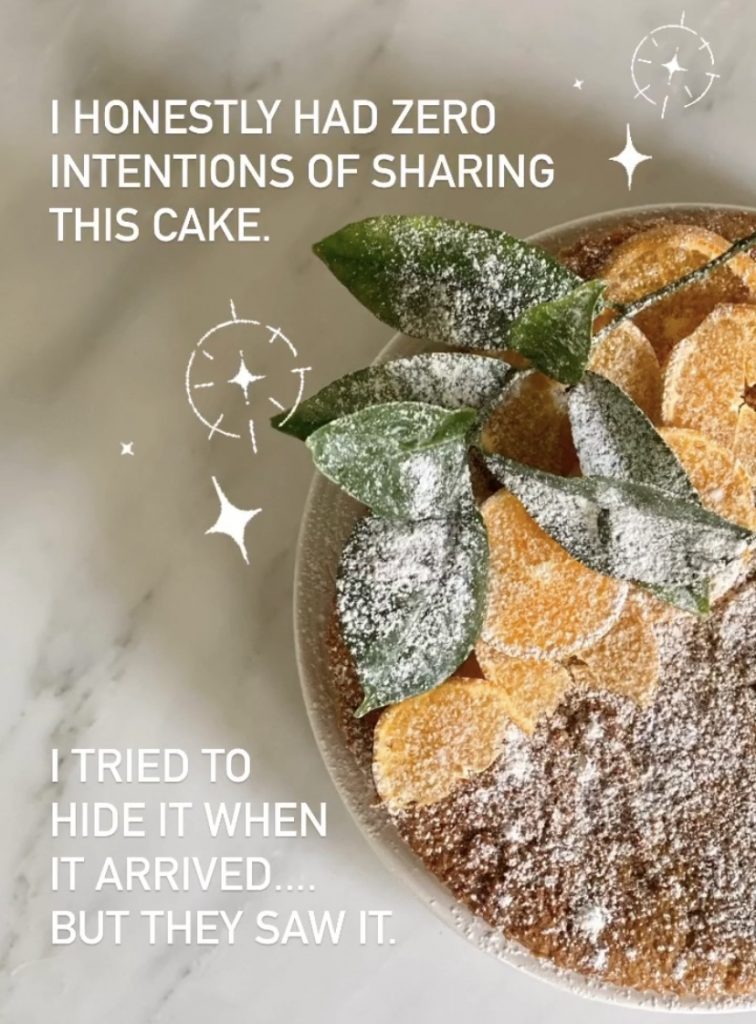 Lauren Conrad on her Instagram story revealed tonight she tried to make a cake for herself without having to share it, but sure enough, the family arrived on the scene and all efforts to not share it went array, but at least Lauren got one piece of Sweet Laurel Bakery’s Clementine Olive Oil Cake.