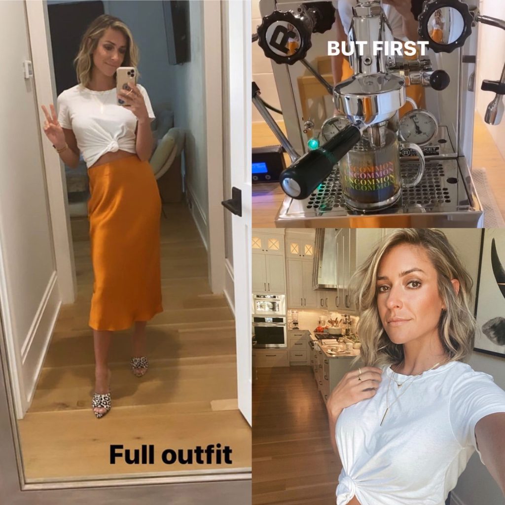 In celebration of Kristin Cavallari’s Uncommon James Demi-Fine Jewelry launch, Kristin got her UJ Instagram takeover work day today off to a great start by modeling every piece from the UJ Demi-Fine collection with Kristin’s work outfit of burnt orange skirt with knitted short sleeve white blouse, while mixing it up with new UJ Fall 2020 pieces like black enamel.
