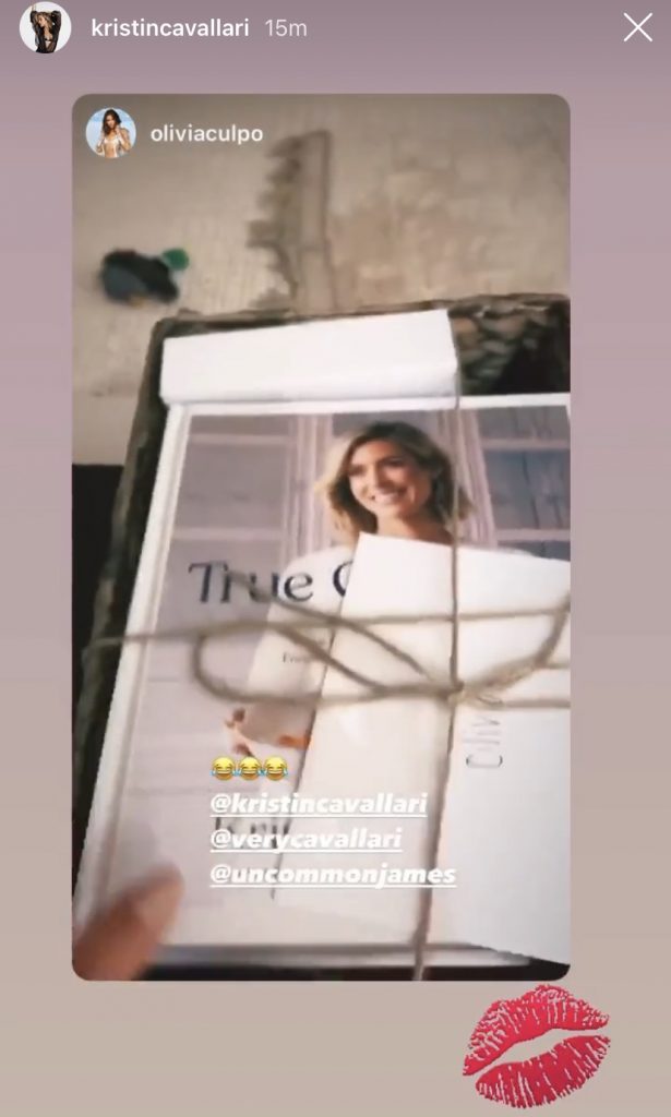 All throughout Olivia’s story, Olivia elaborates a Kristin centric post, with Olivia opening up her gifts from Kristin which start apparently with “True Comfort”, and an Uncommon James gift bag filled with UJ jewelry, plus Olivia has Kristin’s E! Reality Show, “Very Cavallari”, on her TV screen, which Olivia’s dog barks at every time it’s on the screen.
