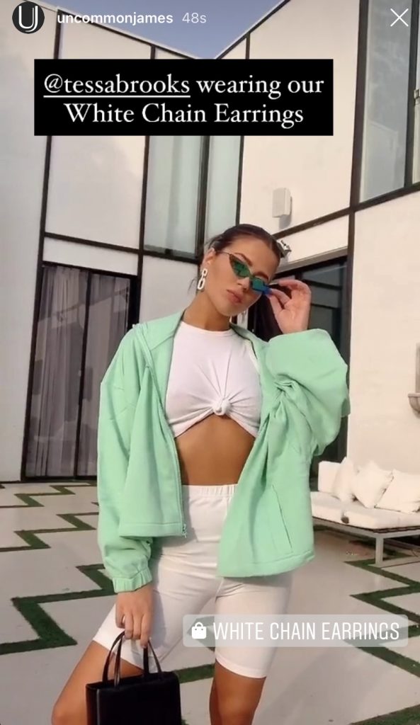 The UJ White Chain Earrings are a can’t miss, classic style being so versatile, worn with an elegant and sophisticated touch, or an edgier way with combat boots and vintage tee, Tessa’s also seen wearing the UJ White Chain Hoops in another shot Tessa took of herself.