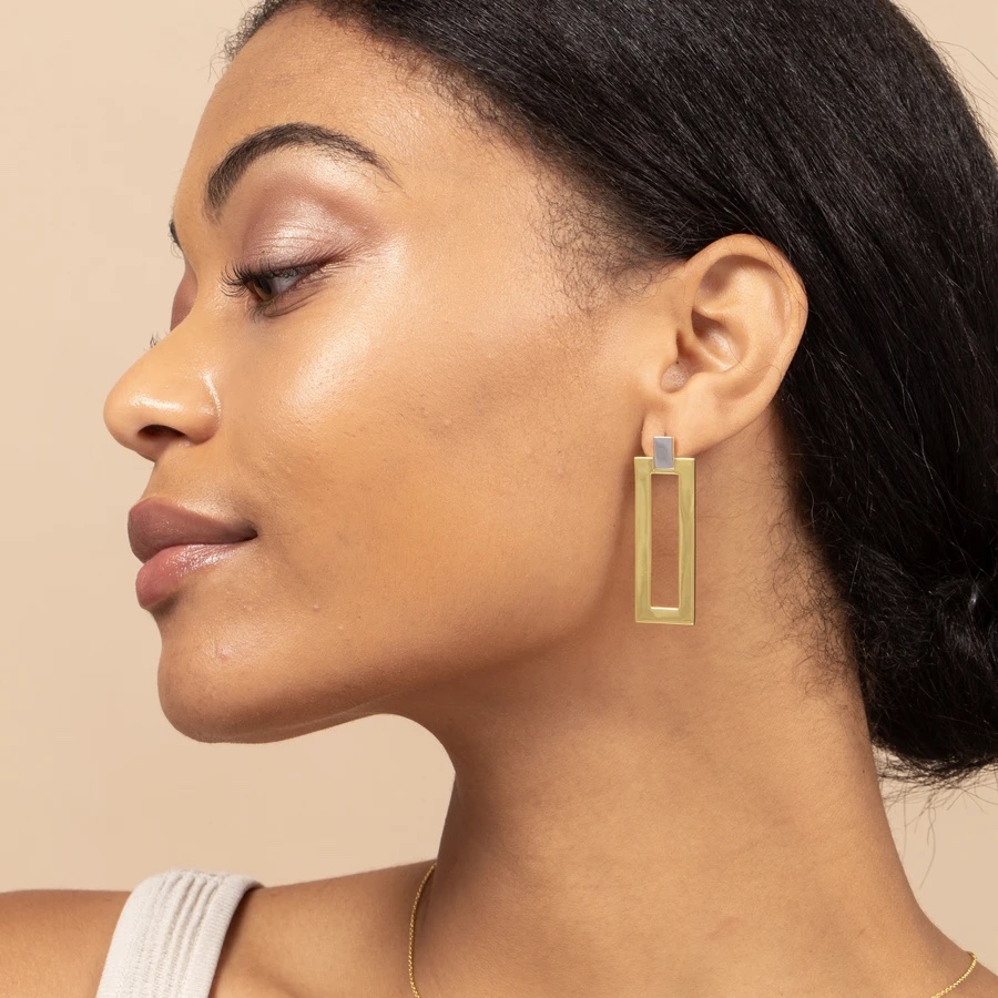 Mixing metals just got easier, and even more fashionable, with Kristin’s UJ Milan Earrings, these rectangle drop earrings feature a silver square at the stud with an open rectangle below, created with both 14 karat gold and rhodium plating.