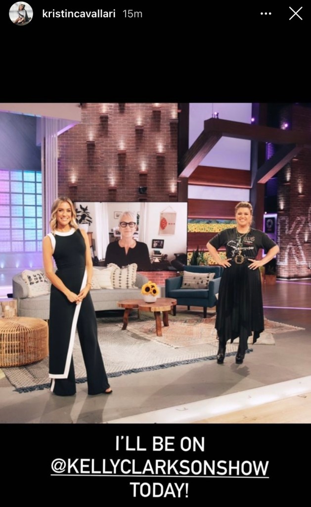 Kristin Cavallari gave a quick glimpse of her appearance on “The Kelly Clarkson Show” today with Kristin wearing a black jumpsuit with a straight white line on the side of the jumpsuit social distancing 6 feet away from Kelly.