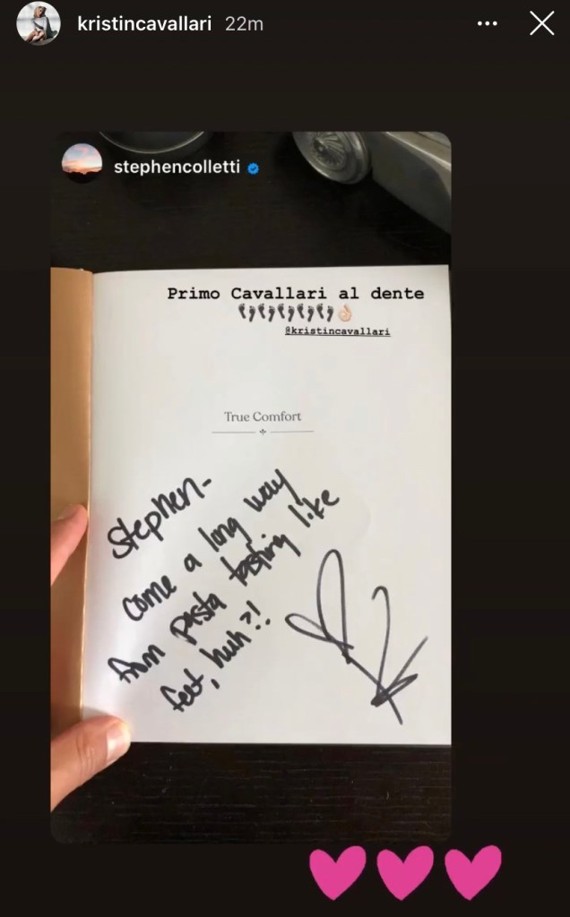 Kristin Cavallari sent her popular cookbook, “True Comfort”, to another near and dear friend today, it’s none other than “Laguna Beach” high school sweetheart, Stephen Colletti, who left Stephen a note too in the book about how he’s upgraded his cooking skills from pasta feet.