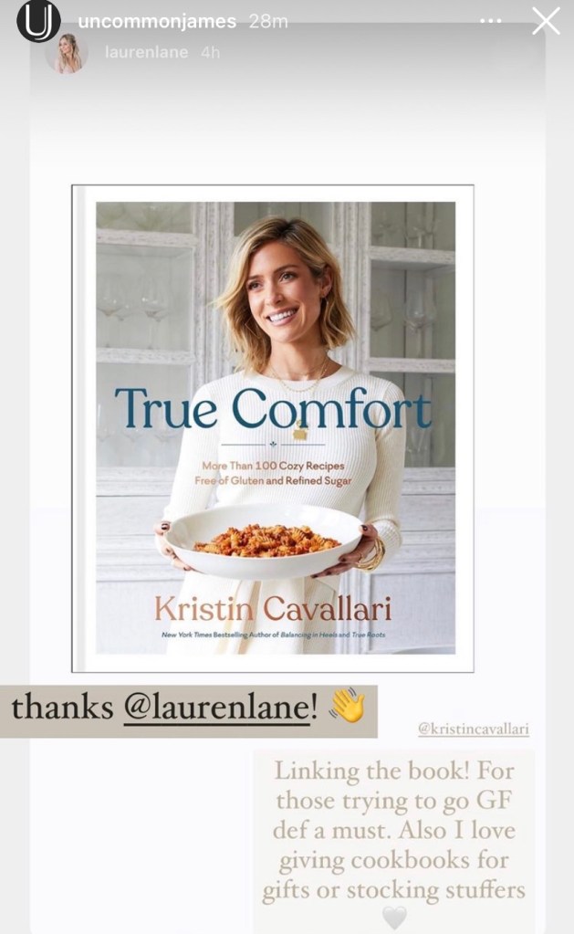The holidays can be rich with sweet and savory foods along with loads of libations, but it can be depleted of healthy foods, so what best way to cook good all year long, and even during the holidays are the gift of “True Comfort” by Kristin Cavallari, also by Uncommon James, which “True Comfort” fan, Lauren Bushnell Lane, plans to gift to her family and friends this holiday season, especially as stocking stuffers.