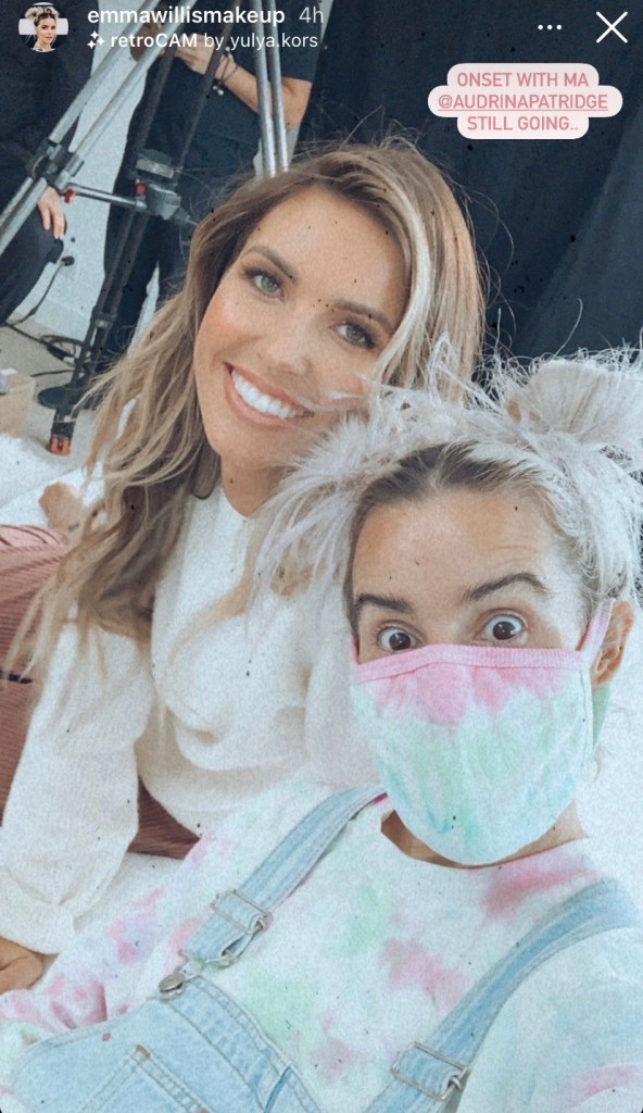In between takes for season 2 of MTV’s “The Hills: New Beginnings”, Audrina Patridge and her Makeup and Hair Stylist, Emma Willis, hung out on the set while the crew was hard at work adjusting set up and/ or conquering playback, Emma’s in tie-dye suspenders where mask colors match Emma’s outfit, and Audrina showed off all the white possible.