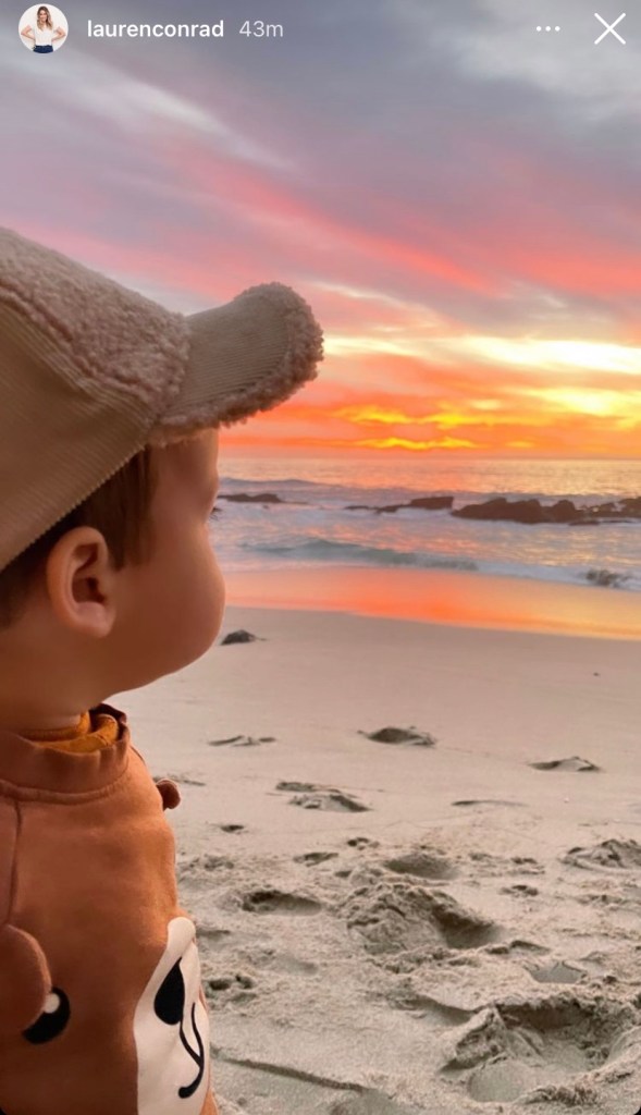 Here, Lauren Conrad’s youngest son, Charlie Wolf Tell, looks over to the Pacific Ocean in California that sits in Lauren’s hometown of Laguna Beach, California, where Charlie sits Monday evening as Lauren post early today, looking directly at the sunset wearing a beige lamb beanie with the teddy bear sweater.