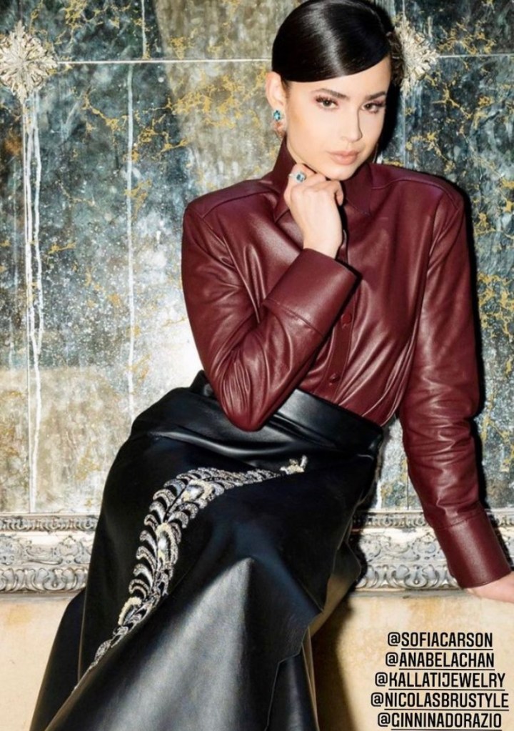 Sofia Carson, who’s a star in her own right on the Disney orbit, sets the tone of sexy and elegant today with jewelry and diamonds by Anabela Chan and Kallati Jewelry, followed by leather burgundy blazer and black long skirt styled by Nicholas Bru, all powered by Dorazio PR.