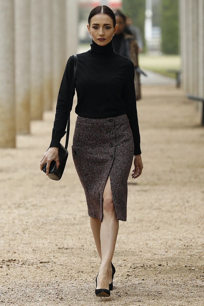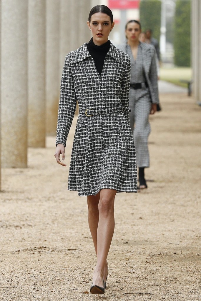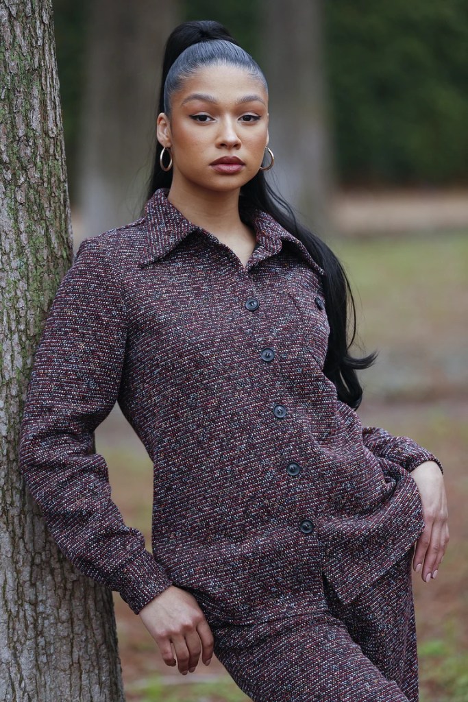 Negris Lebrum’s thick black and gray textured tweed patterns found on its skirts, dresses, blazers, button-down shirts, and pants bring out the rugged exterior Travis found in the public parks of Houston, stemmed from the Louisiana Bayou.