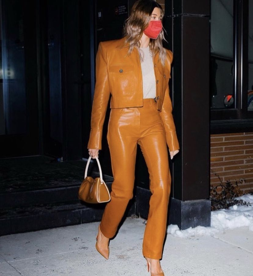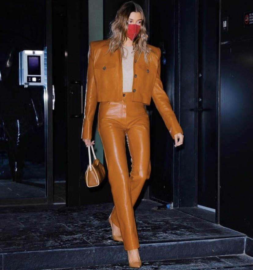 Hailey Bieber, better known as Hailey Baldwin, or now the other half of Justin Bieber, had a chic moment Wednesday night as Hailey wore burnt orange from top to bottom, plus Kaze Origins KN95 face mask to contrast the outfit, plus fall in line with crayon colors and rainbow wearing red mask, powered today by DorazioPR.