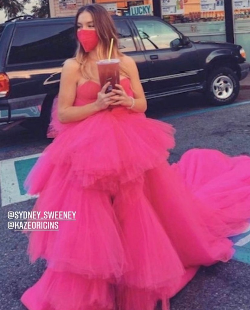 Sydney Sweeney, who’s a certified rising star in Hollywood with 3 million followers on Instagram, got her weekend off to a pink start thanks to DorazioPR tonight, Sweeney has an extremely wavy dress outside a nearby 7-Eleven holding a Big Gulp tea, but staying safe from COVID19 with a Kaze Origins KN95 Face Mask in fuchsia, which is the color of Sydney’s special dress as a matter of fact, Kaze is layered with 5-ply class-A material that keeps COVID from going in and out.