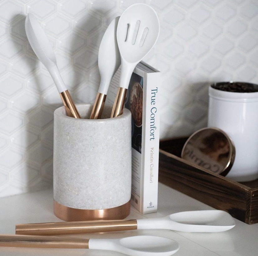 Who says cooking can’t be done in style? The White + Copper Utensils (Set Of 5) are Ladle, Slotted Spoon, Slotted Turner, Round Solid Spoon, Oval Solid Spoon in copper-plated aluminum and white powder coat.