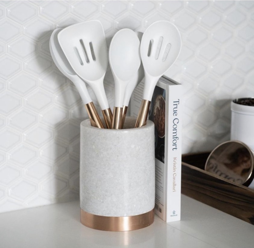 Elevate your kitchen with this chic Marble Utensil Jar. Pro tip: Store it in the freezer to use it as a wine chiller!