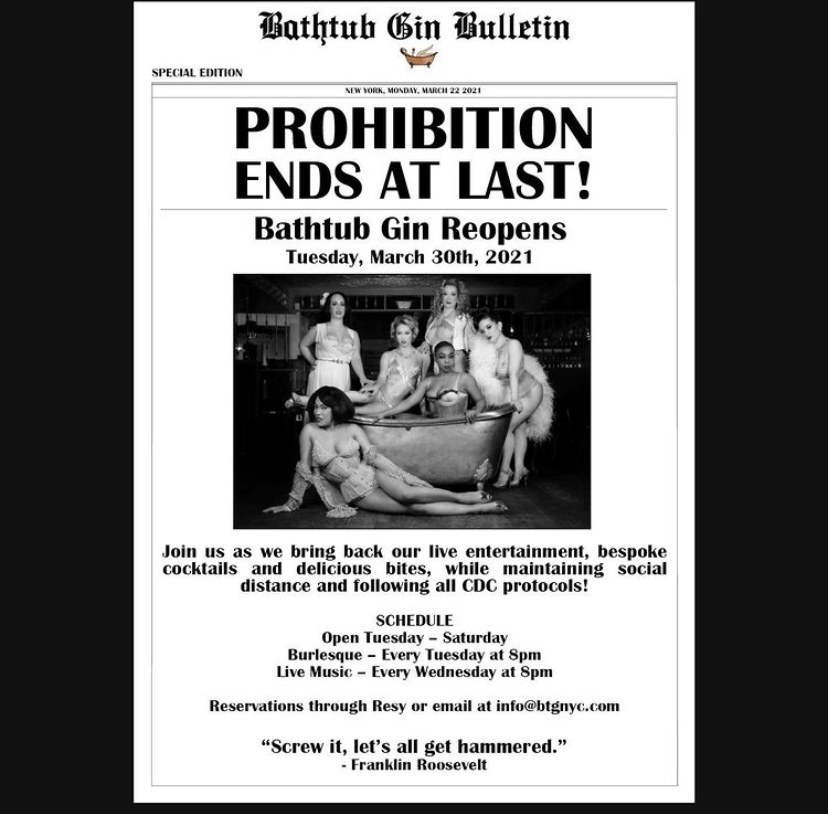 In what has been a very long year and slight change of lockdowns, shutdowns, sorrow, and departures at every level, it’s finally time to step back into the water of Manhattan nightlife car we’ve always known it, albeit without 4 a.m. or even 2 a.m., it’s the return of one of NYC’s most famed destinations which Joonbug also is proud to make you aware of, it’s Bathtub Gin reopening tomorrow night at 8 p.m. EDT, with cocktails, bites, social distancing, and CDC protocols to keep party goers safe, after NYC shutdown last year.