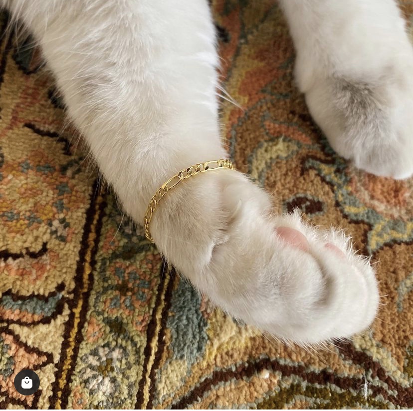 Uncommon James tonight proudly placed its gold UJ Glided Bracelets that come in sets of 5 onto a fine feline white-furred cat that didn’t mind sitting pretty on the rug while showing off fine bling that’s 3 different chains in 14 karat gold plated dainty chains.