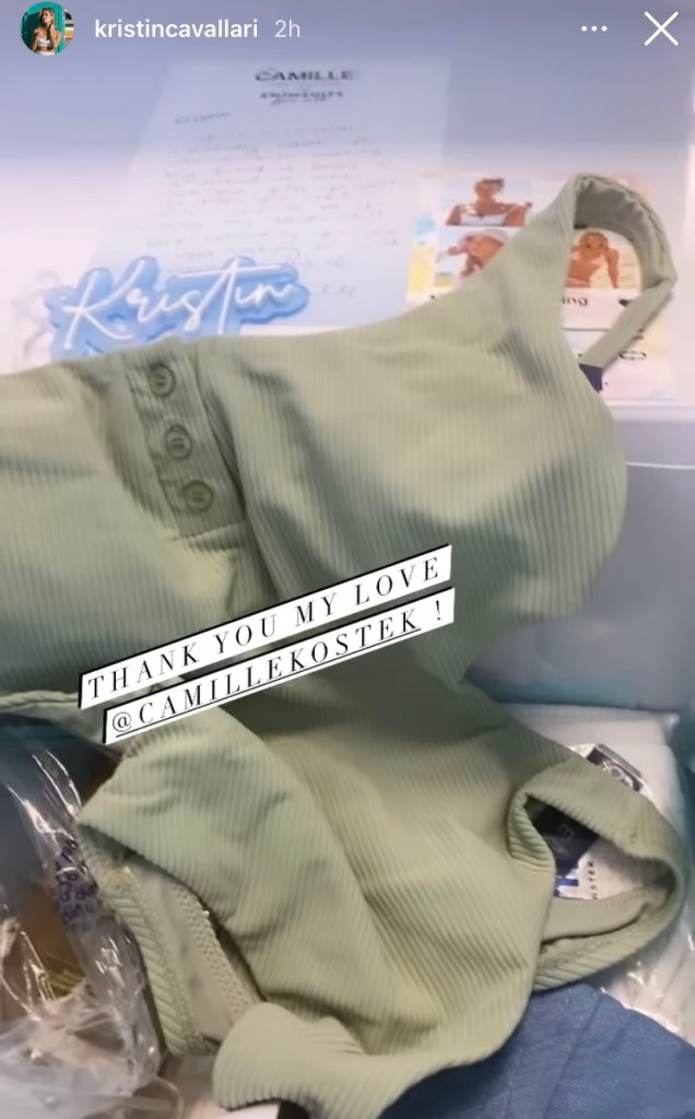 Kristin Cavallari was definitely for the beach today as Kristin was sent official swimwear by one of her friends, who is Camille Kostak, who also models swimwear, and is a master of other professions such as cheerleading in the NFL, and host of TBS’s “Wipeout”.