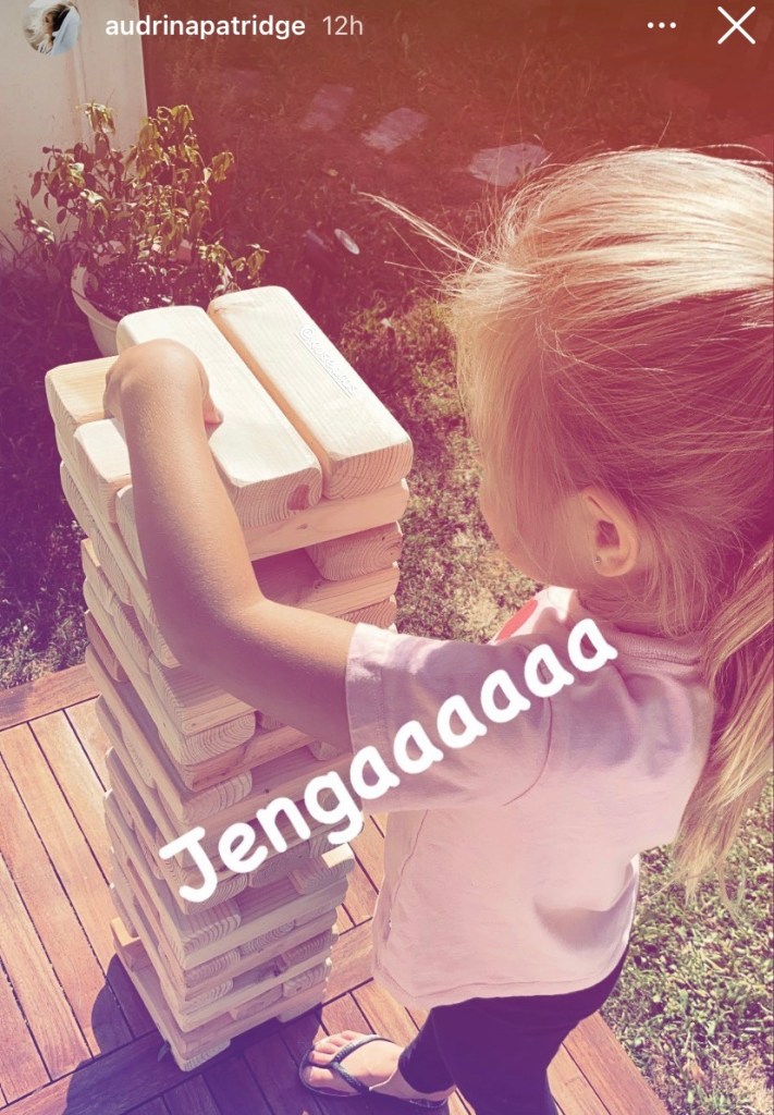 Games are fun, games are hard, sometimes easy, and quite often they’re mind blowing, but it also takes skill and concentration to master 1 game, and that’s Jenga, where you take a piece of wood from the bottom and put it on top, it keeps going and going till one from bottom or top topples the tower over, that’s what Audrina Patridge’s daughter, Kira, worked on Saturday as Kira was learning the concept of Jenga.