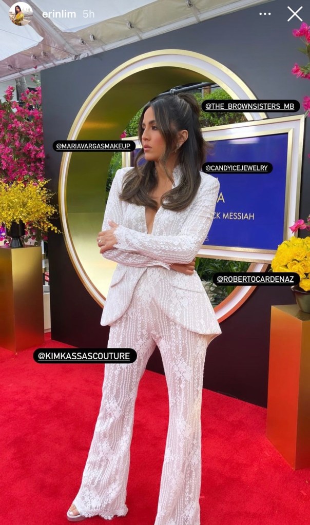 Erin Lim got right to work on Sunday out at the 93rd Academy Awards in Hollywood, California doing red carpet reporting duties for E! News, not only was Erin in a white lace pattern and design pantsuit, but Erin blinged out in Candy Ice Jewelry earrings and rings.