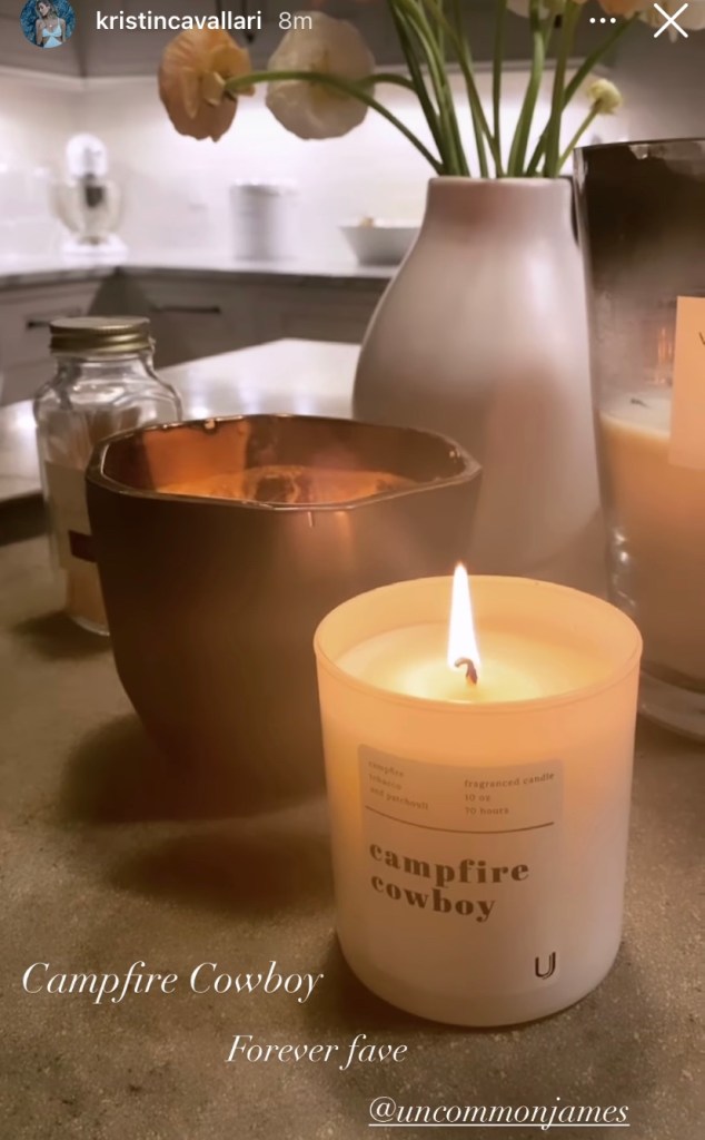 Kristin Cavallari thought it was a neat idea tonight to put some aroma into her home, it’s the Uncommon James Campfire Cowboy Candle that’s 10 ounces and will have you daydreaming about bonfires on warm summer nights and longing for a vacation to the wide open Midwest, it’s also created with all natural, soy wax and free of any phthalates, dyes, and irritants.