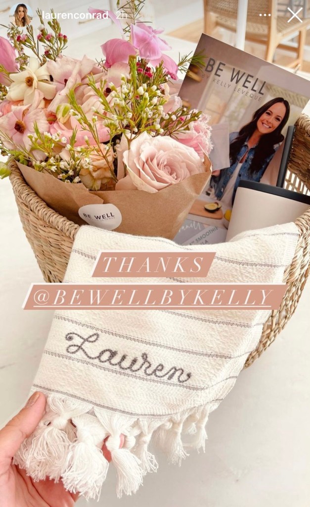 Lauren Conrad received a nice litter of gifts today from one of her good friends, Kelly LeVeque, who runs the health destination, Be Well By Kelly, that’s filled with a bouquet of flowers, reusable straw cup, basket, and a towel made with the name “Lauren” on it.