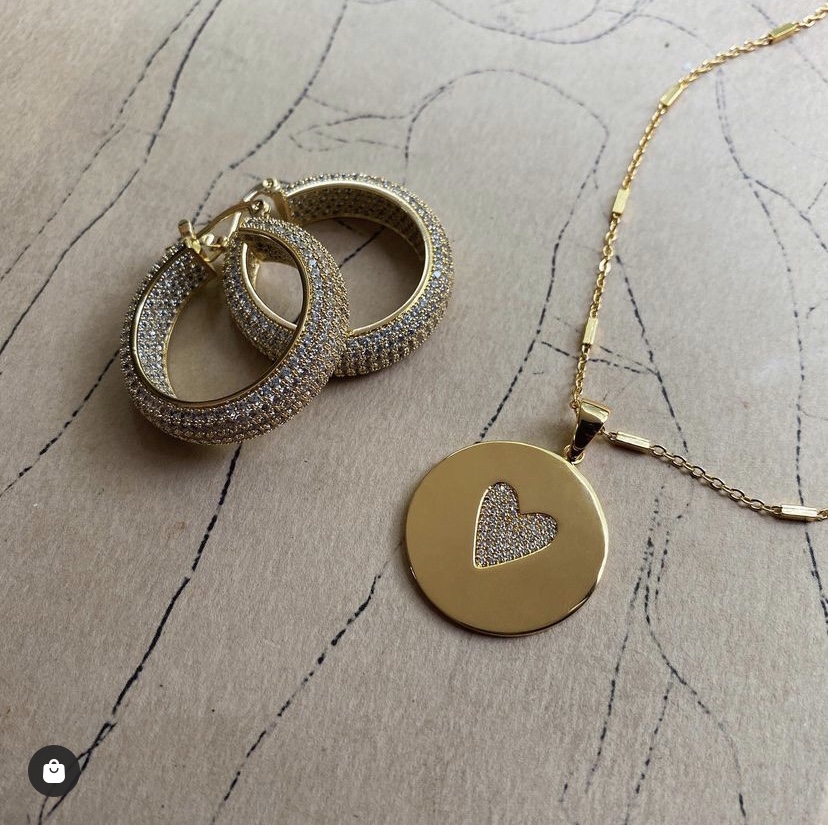 The Uncommon James collection got into the deep and dazzling side of their UJ jewelry today with a Pave look of UJ Ritz Hoops with sparkling stones and 14 karat gold, and UJ Protective Necklace with center pendant that’s 14 karat gold and sparkling heart in the middle, and dainty bar details.