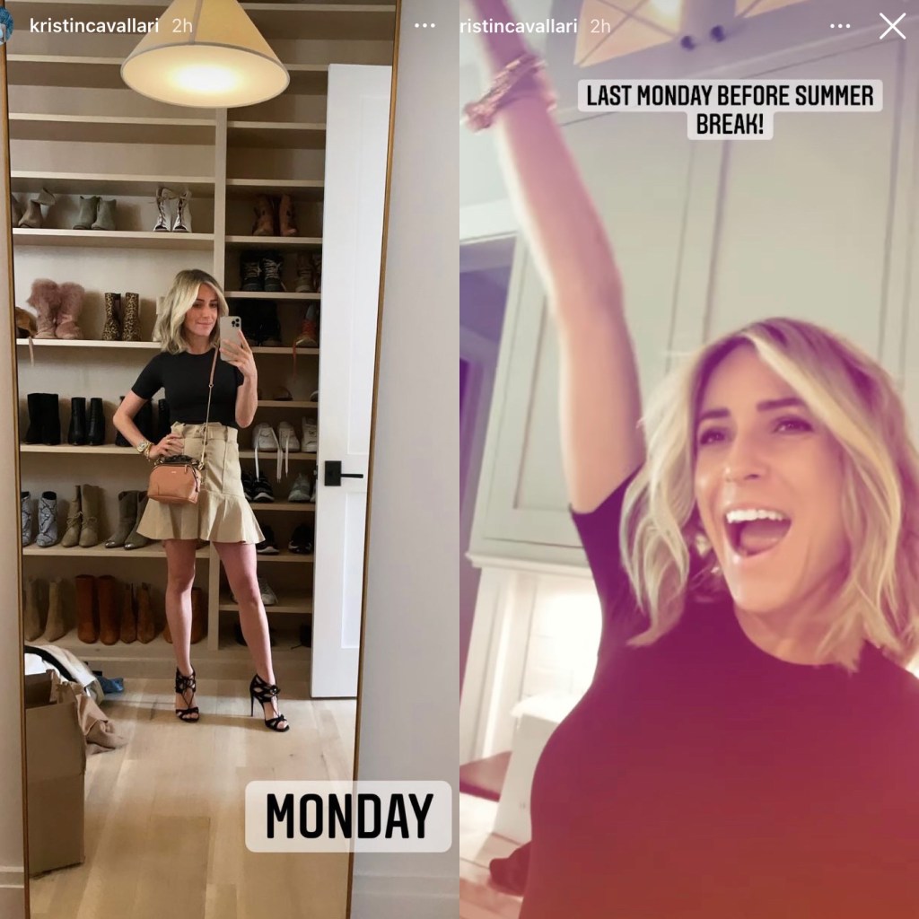 Kristin Cavallari kicked off the new week today by showing off a Monday look of black short sleeve blouse, beige skirt, black high heel sandals, and brown handbag, followed by a big hands up cheer for this Monday being the last Monday before Kristin’s children are out of school for the summer.