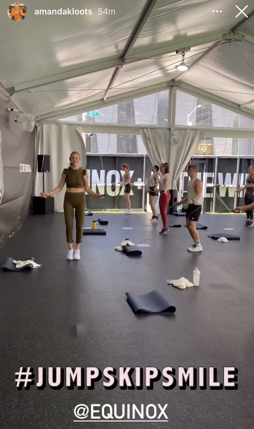 Amanda Kloots got right to it today with her AK Rope class at Equinox, Amanda was at Equinox outdoors on 30th Street and Tenth Avenue where Equinox In The Wild tent is located for people to workout as it is a safe space against COVID, with all the room to workout, and you are less susceptible to catch the virus, EQX In The Wild is also in the Hudson Yards area of Midtown Manhattan, where Equinox Hotel and Equinox destination location is, and where Amanda will be teaching tomorrow.