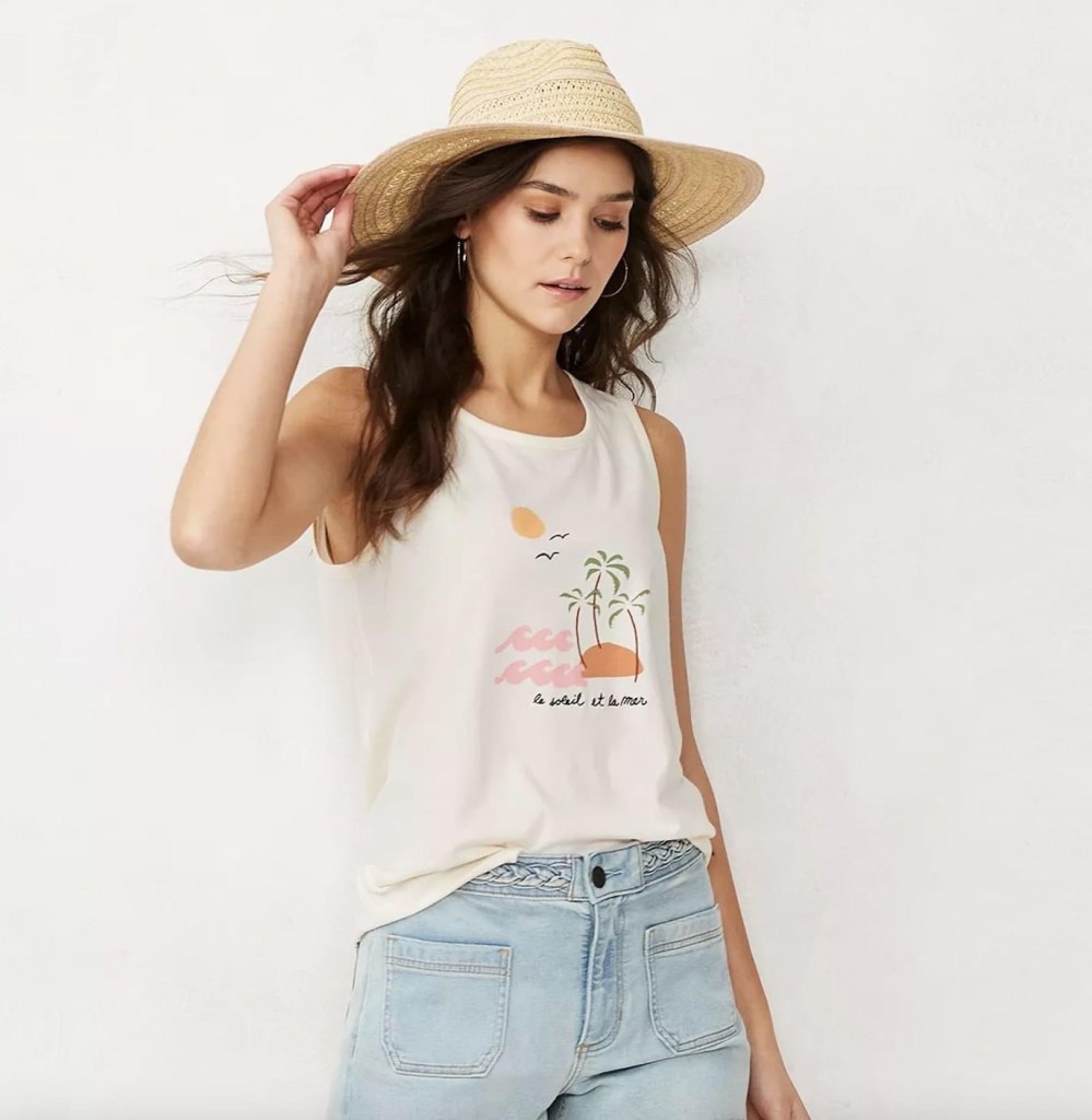 You can also add another Summer uniform to your LC Lauren Conrad item as palm trees, beach, the sun, and waves are apart of this LC Graphic Tee that pairs perfectly with jean shorts and sunhat from LC Kohl’s itself.