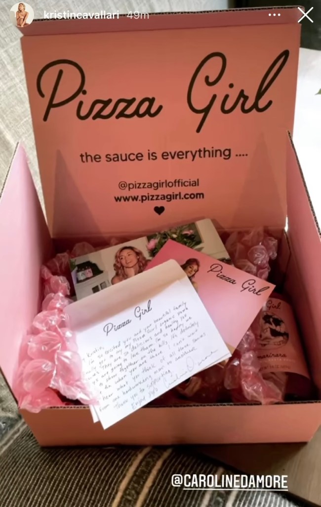 If you’re making a homemade pizza tonight, make sure you have all your pizza ingredients to bake the best pizza of your dreams, but if you don’t have the sauce, then what is it, here comes Caroline D’Amore gifting Kristin Cavallari a jar of her Pizza Girl sauce where the pizza’s saved, or pasta just to keep things simple.