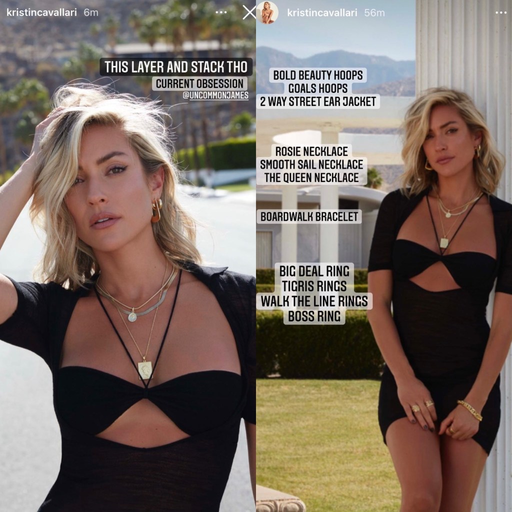Kristin Cavallari confesses today she’s got a new Uncommon James obsession in her life, it’s layers of UJ jewelry that includes hoops and ear jackets, 3 necklaces, Boardwalk Bracelet, and 4 UJ Rings that fit the description of Kristin’s current obsession.