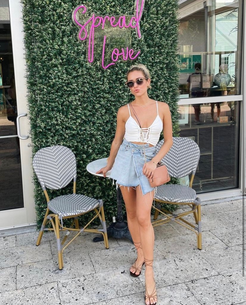 Kristin Cavallari was all about enhancing love wherever should tonight in her weekend girl trip to Florida as Kristin posed in front of a pink “Spread Love” greenery sign wearing white crop top with Jean shorts and beige high heel sandals, plus pink handbag to complete the Florida flamingo look.