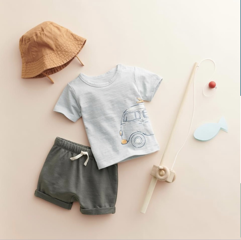 Little Co. by Lauren Conrad puts together the perfect Summer beach outfit today that has LC Little Co. drawing from its true staples of bucket hat, Dolman Organic T Shirt, and Roll Cuff Shorts, all done in orange, dark green, and light blue.