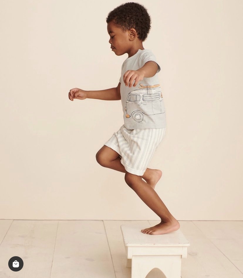 The weekend being over doesn’t always mean doom and gloom, especially if it’s Summertime with Little Co. by Lauren Conrad and it’s Organic Short-Sleeve Graphic Tee in van blue with Organic Roll Cuff Shorts in stripe white.