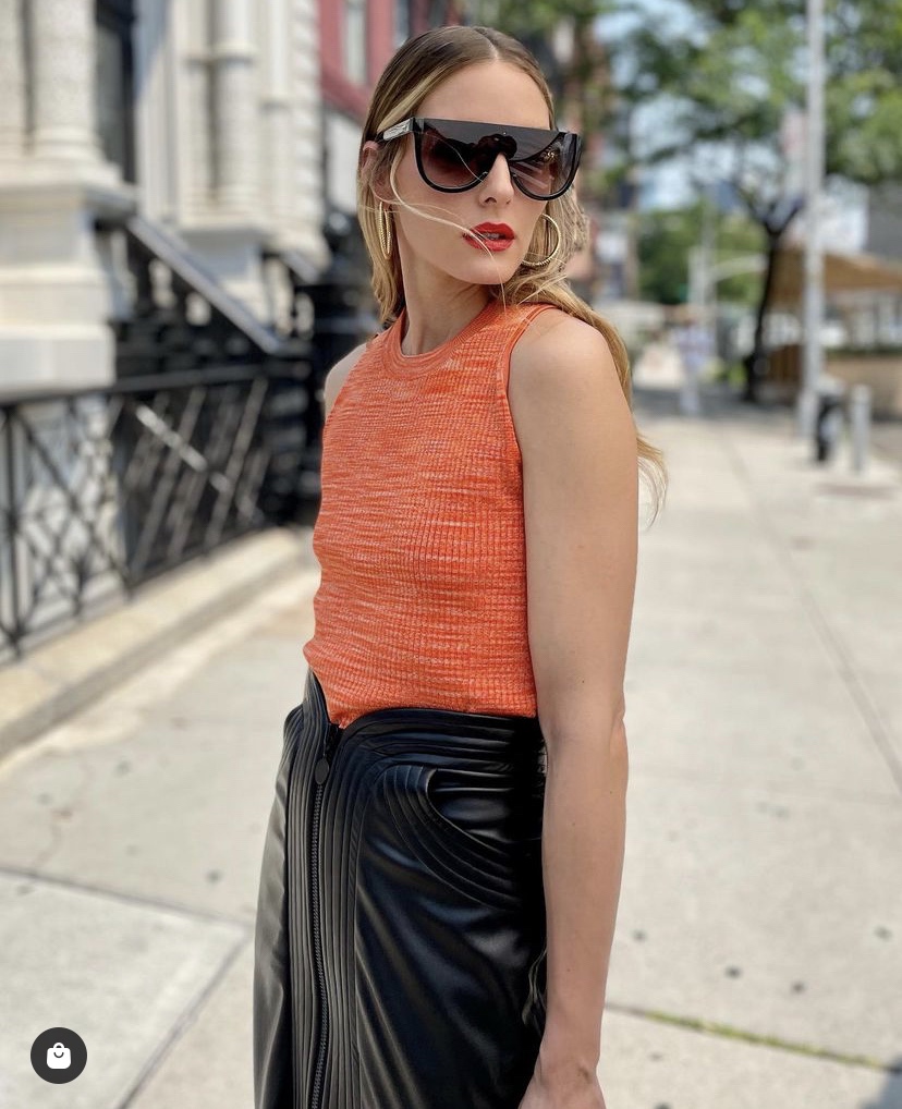 Olivia Palermo, who’s the maven socialite of Manhattan, was down in Lower Manhattan’s Bowery Street today doing a photo shoot for her Olivia Palermo Beauty Matte Lipstick in Poppy, also wearing and tank orange red blouse with the Maria Lucia Hohan Pre-Fall 2021 Vegan Leather Skirt.