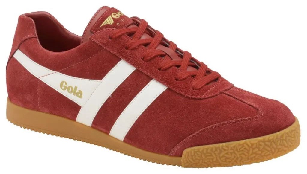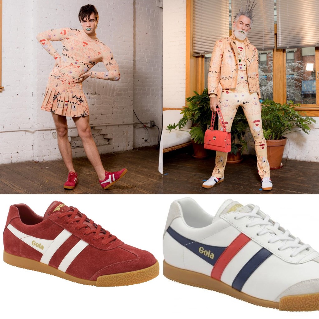 Dauphinette continues on with their prints of hearts, objects, and elements onto mock turtleneck and pleated skirt on one of their male models wear a pair of Gola Classics Men’s Harrier Suede Sneakers in Deep Red/White, red it an extremely perfect color for this look of Dauphinette who’s idea of fashion includes happiness for people, places, and things on Earth.
