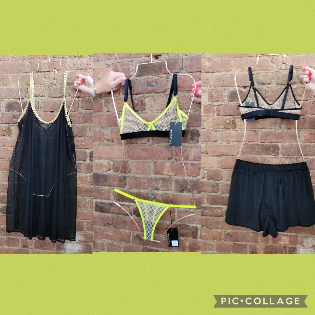 Masha Titova is the founder of this very trendy collection. Neon is really hot for fall and her line mixes it with black/beige so it’s not too much neon on your body. As I’ve been noticing that the new style in bras is the no underwire bra for comfort and this collection is full of them. They have 35 sizes of bras because the owner’s friends kept saying “Oh I love your bras but do you have my size in them?” Size XS = 30A/B, 32A/B; Size S = 32C/34AA/34A/34B; Size M – 32D/34C/36A/36B; Size L = 36C/D, 38A/B; other sizes are: 32E/F; 34D/E; 34F/G; 34G/H; 36D/E; 36F/G; 38C/D; 38E/F; 40A/B; 40C/D. All made in USA and wear tested by the designer. Fabrics are geometrics, sheer fabrics with diamond motifs, black illusion, beige polyester trimmed with green neon as seen in my photo. All machine wash cold water in a mesh bag so nothing tears or rips and tumble dry low. Other styles are thong and high waist brief panties, bodysuits and sleepwear. Bras $100.00, thongs $35.00 bodysuits $100.00 and sleepwear $100.00 – $200.00.
