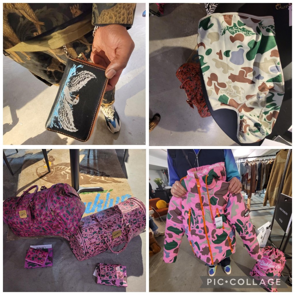 Francis London started the company because in 11th grade in New Jersey he got picked on by his classmates because he came from Africa. He then read the book “The Ugly Duckling” and identified with it so much that he names his company after it. This is a premium streetwear brand that is Gender Neutral. Frances designed the camouflage print that comes in pink, orange, purple and military green in genuine leather duffle bags with shoulder straps that come with a matching scarf that retails for $800.00 and wallets that come in a gift box retailing at $350.00. A clever idea is the boarder of the scarf is repeated in the lining of the bag and wallet. The hoodie is in the military green camouflage print for $100.00 and can be seen in the top right-hand side of the photo. Puffer jackets come with a matching drawstring bag with slogans “Be Ugly or Be Normal”, to tote the jacket around with when it’s too hot to wear it. Sizes S – XXL with a retail of $450.00. Again, caring out his Ugly Duklyn theme are duffle bags/wallets where one side is a duck print and the other side is a swan print as worn by the designer himself in the upper right corner of the photo. To go buy this fun collection of matching items WWW.UGLYDUKLYN.COM