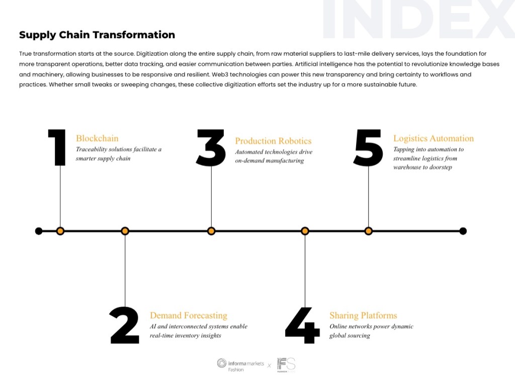 AI being the one thing that saves the fashion industry and destinations like New York Fashion Week a hot spot again are broken down into 5 aspects like Blockchain with traceability, Demand Forecasting detecting inventory need, Production Robotics with manufacturing on-demand, Sharing Platforms to globally source online, and Logistics Automation using automation to b-line product from warehouse to doorstep as fast as possible.