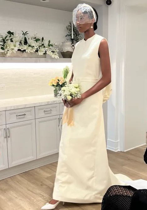 For those who don’t see themselves in a traditional wedding gown, Victor dE Souza created pantsuits that were double-breasted blazers with pearl buttons, slim pants colored in white.