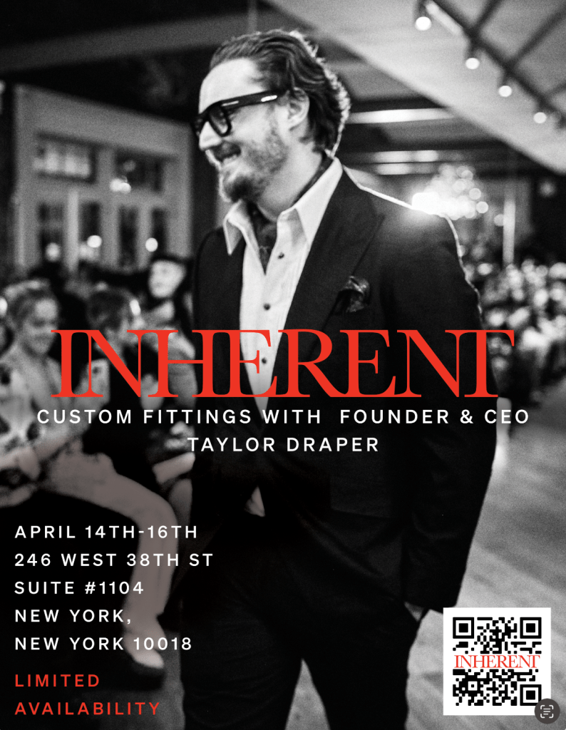 To schedule your own appointment to experience the INHERENT collection first hand, meet the designer himself, or to be custom measured for a piece of the collection, click on this link: Book an Appointment